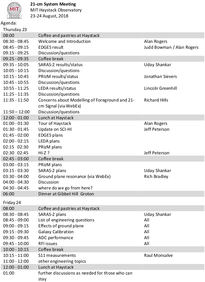 Thank you all for participation in the 21-cm Systems Workshop at Haystack 23/24 August 2018. Judd, Raul and I found the talks, discussion and interactions extremely useful. A lot was earned about how to improve the 21-cm systems with the goal of finding the true global absorption and agreement between different systems.